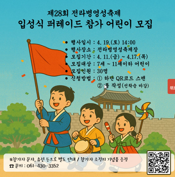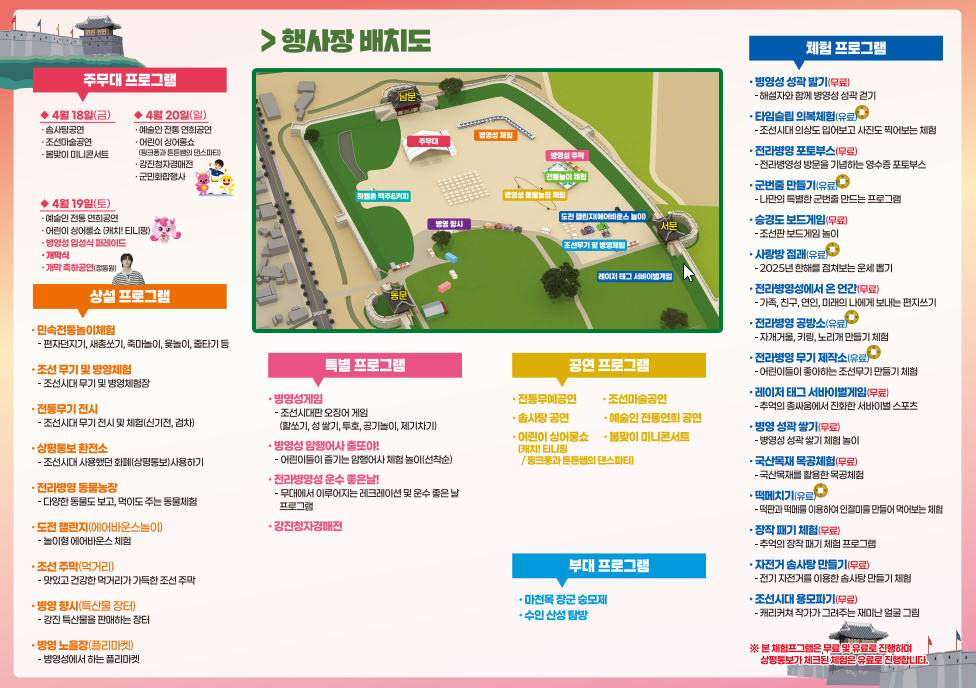19일엔 전통 연희 공연과 어린이 인기 캐릭터 ‘캐치! 티니핑’ 공연이 열려 가족 단위 관광객이 즐기기 딱이니다. 같은 날 오후엔 마천목 장군의 병영성 입성식 퍼레이드가 펼쳐지고, 어린이 30명이 참여해 더 활기차죠. 20일엔 예술인 전통 연희공연,강진청자경매전,어린이 싱어롱쇼, 전통 무예공연 등이 이어져 조선시대의 호국정신을 생생히 느낄 수 있습니다