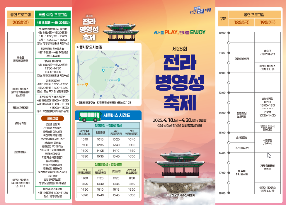 강진 전라병영성축제는 매년 4월 중순, 전라병영성 일대에서 열립니다. 제28회 축제는 4월 18일부터 20일까지 3일간 진행됩니다. 강진군청 자료에 따르면, 이 축제는 1997년부터 시작해 올해로 28회를 맞았으며, ‘과거를 PLAY, 현재를 ENJOY’를 주제로 다채로운 프로그램을 선보이죠.