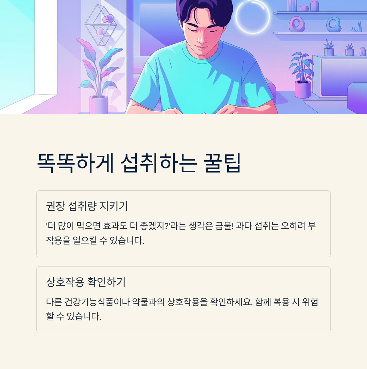 - 똑똑한 섭취 방법: 권장량 준수, 다른 약물/영양제와의 상호작용 확인, 꾸준한 섭취, 건강한 생활 습관 병행이 필수입니다.