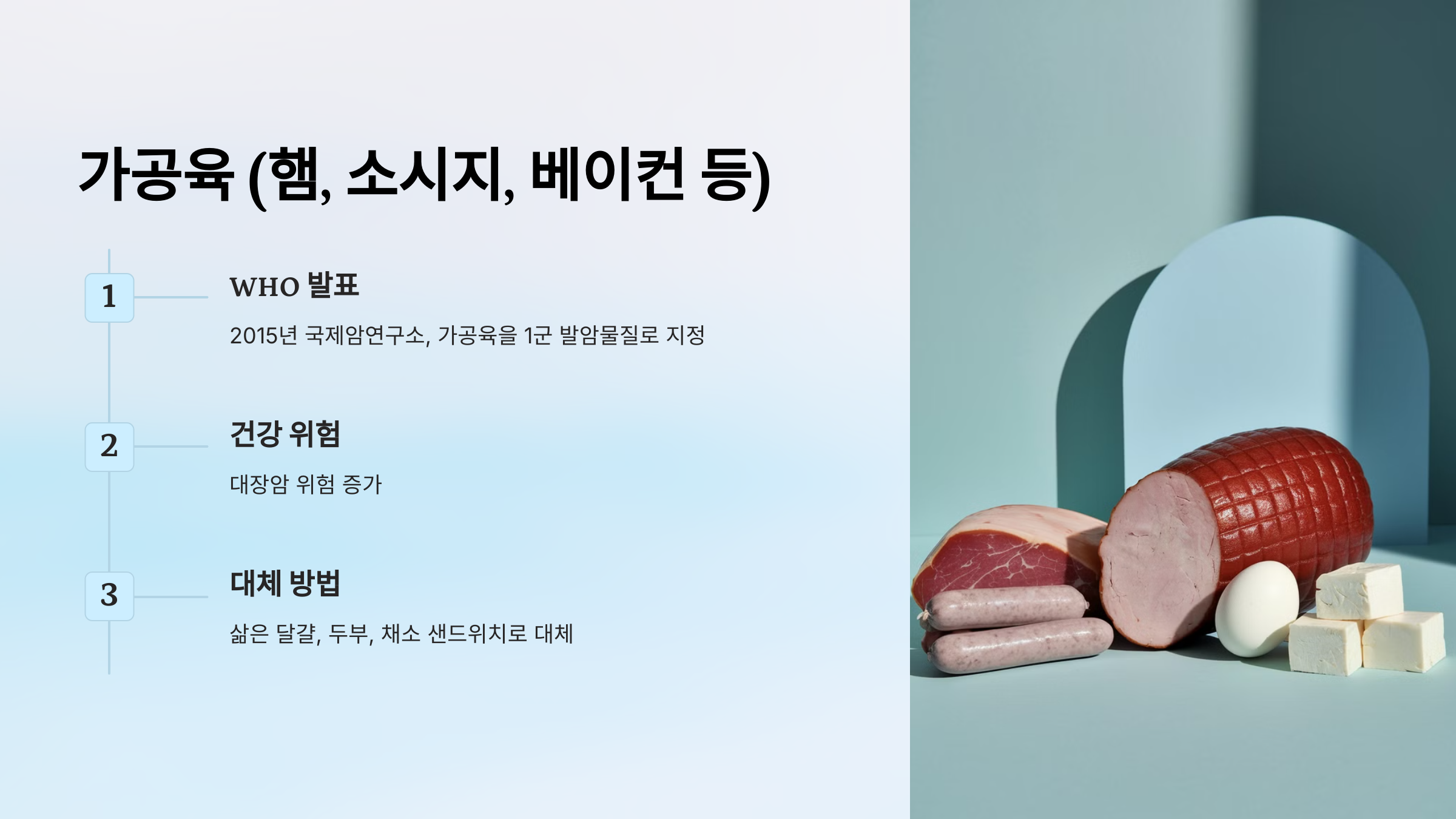가공육은 맛이 좋고 조리하기 편하지만 건강에는 좋지 않은 영향을 줄 수 있어요. 세계보건기구(WHO) 산하 국제암연구소(IARC)는 2015년에 가공육을 1군 발암물질로 지정했어요. 즉, 가공육 섭취가 대장암 위험을 높일 수 있다는 연구 결과가 나왔다는 뜻이죠.