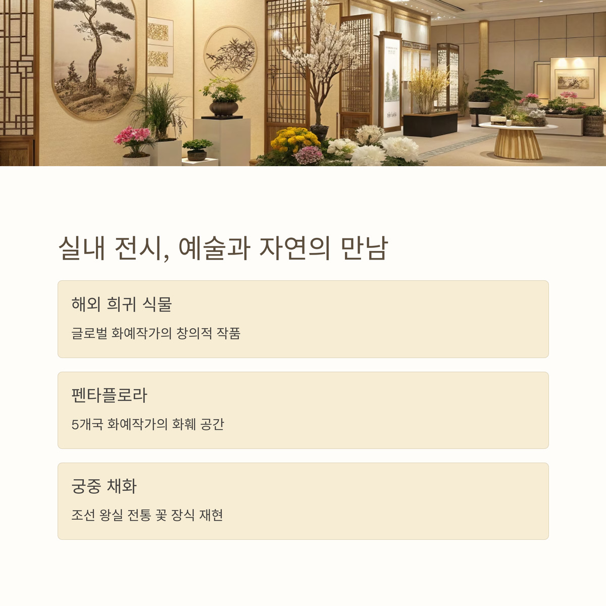 고양국제꽃박람회의 실내 전시는 예술과 자연의 조화예요. 해외 희귀 식물, 이색 식물, 신품종 전시가 고양꽃전시관에서 펼쳐지며, 글로벌 화예작가의 작품이 눈길을 사로잡죠. 특히 ‘펜타플로라’ 전시는 5개국 화예작가의 창의적인 화훼 공간을 선보여요.