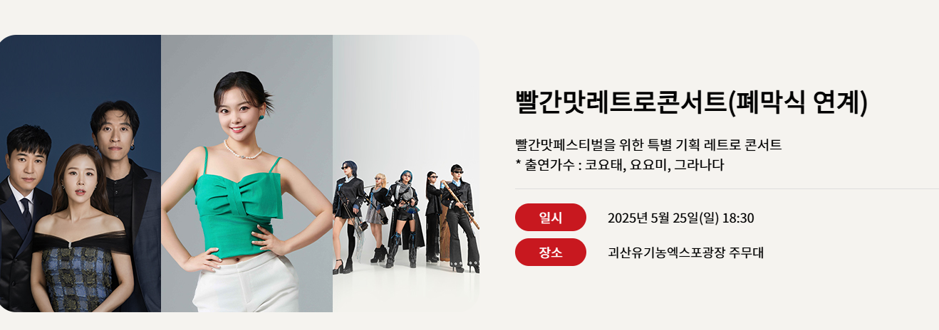 - 특징: 괴산의 청정 이미지와 빨간맛 테마 연출.