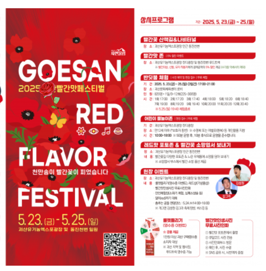 2025년 5월, 괴산으로 떠나 빨간맛과 낭만이 가득한 추억을 만들어보세요. 지금 일정 체크하고, 괴산빨간맛페스티벌에서 봄의 활기를 느껴보세요!
