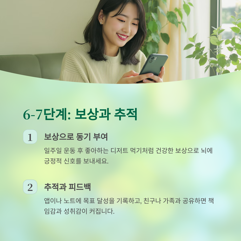습관 형성 과정을 추적하면 동기가 유지돼요. 앱이나 노트에 매일 목표 달성 여부를 체크해보세요. 예를 들어, “오늘 10분 산책 완료”라고 적으면 성취감이 생겨요.