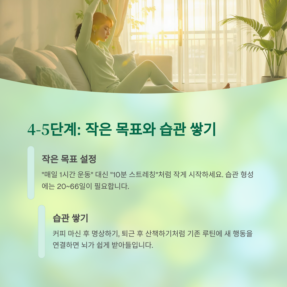 연구에 따르면, 새로운 행동이 습관으로 자리 잡으려면 평균 20~66일이 걸려요. 처음엔 작게 시작해 꾸준히 반복하는 게 중요해요.
