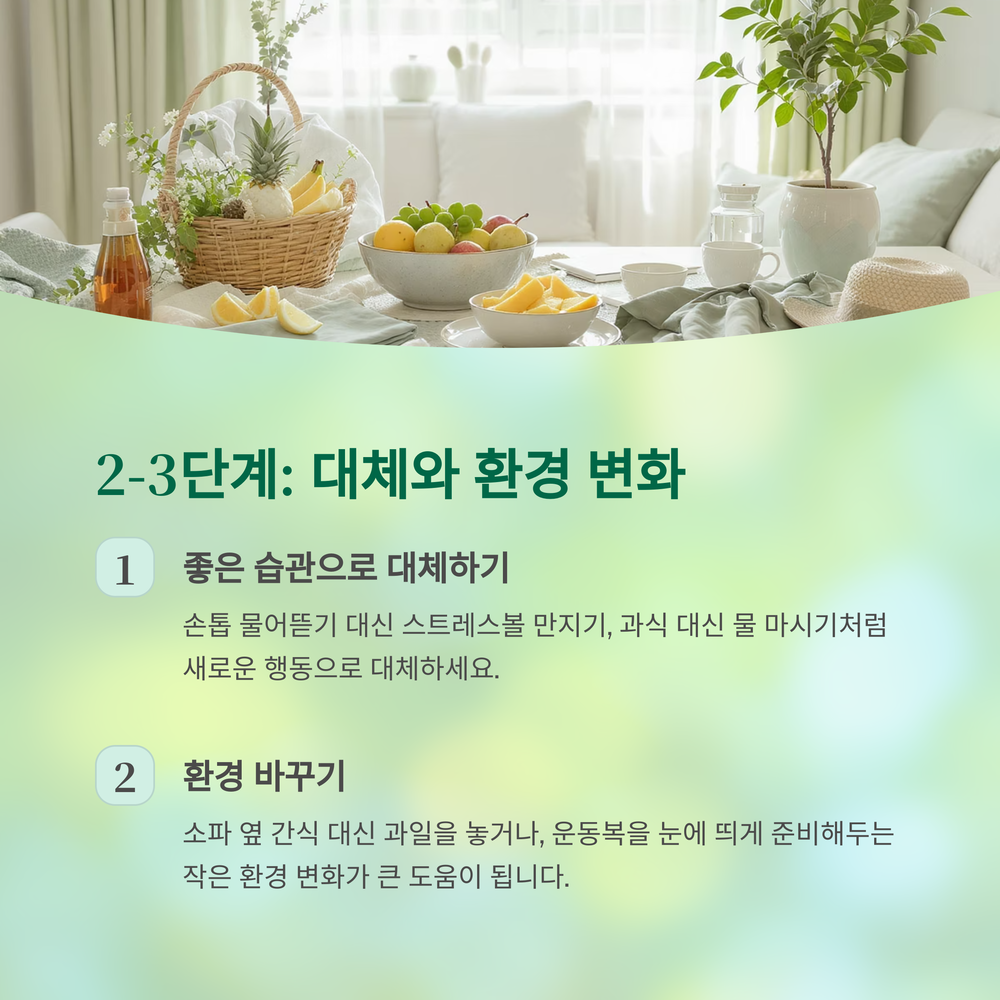 환경은 습관에 큰 영향을 미쳐요. 만약 밤마다 소파에 앉아 TV를 보며 간식을 먹는다면, 소파 옆 간식 통을 치우고 과일을 놓아보세요. 환경을 바꾸면 나쁜 습관의 유혹이 줄어들어요.