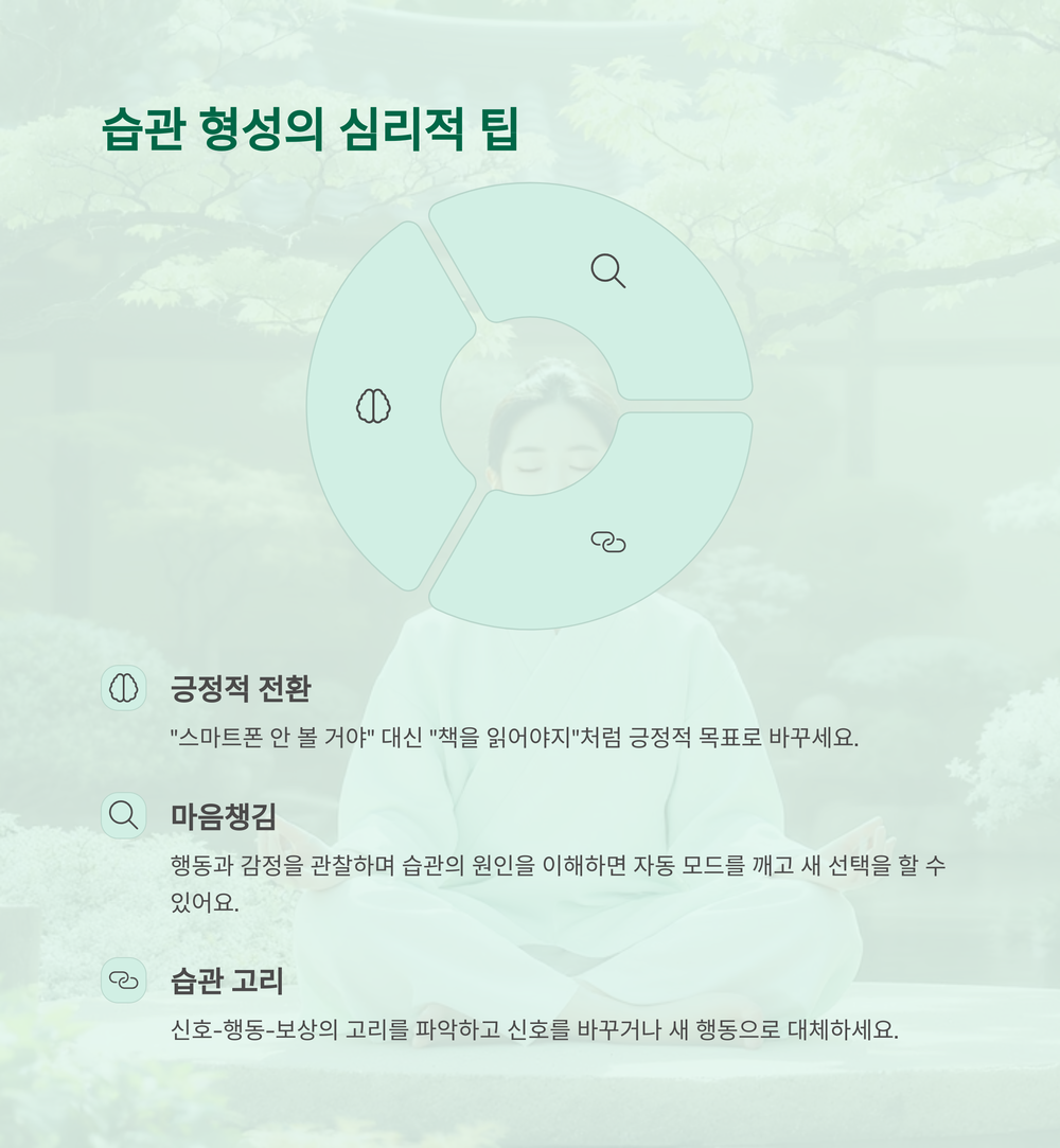 이 방법은 새로운 행동을 기존 습관에 붙여서 뇌가 쉽게 받아들이게 해요. “커피 마신 후 책 1페이지 읽기”처럼 간단한 연결부터 시작해보세요.