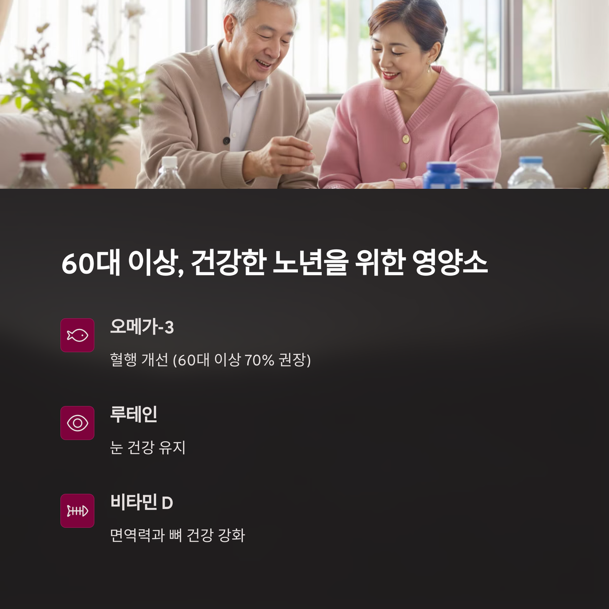 60대부터는 노화로 질병 위험이 커져요. 오메가-3와 비타민 D가 필수예요. 오메가-3는 혈행 개선에, D는 뼈와 면역력을 지켜줘요. 2025년 비타퀘스트 보고서에서 60대 이상 70%가 오메가-3 섭취를 권장받았다고 나왔어요.