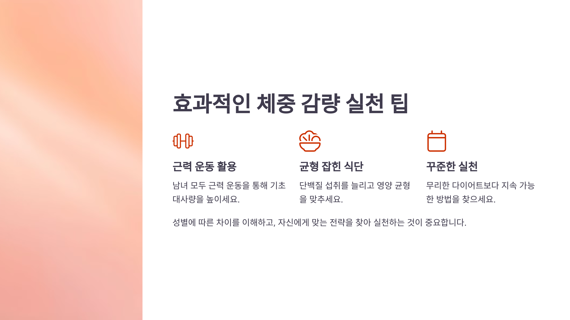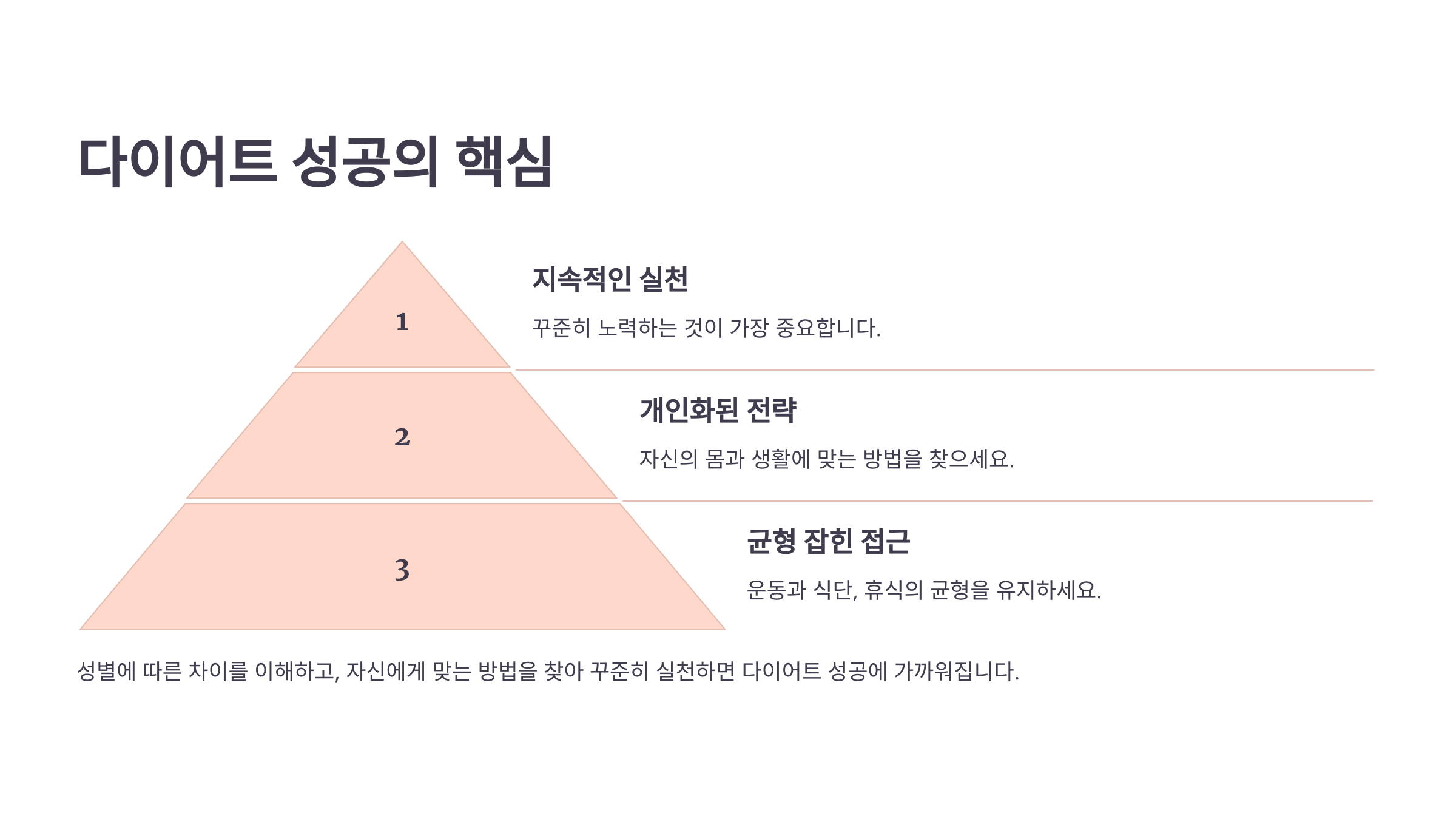 기본 원리는 같지만, 운동과 식단 전략이 다를 필요가 있습니다. 남성은 근육량 유지, 여성은 지방 감량에 초점을 맞추는 것이 효과적입니다.