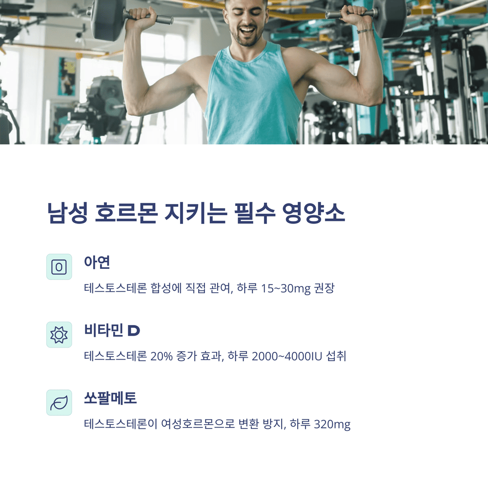 영양제만 먹는다고 남성 호르몬이 쑥 올라가는 건 아니에요. 근력 운동 병행하면 효과 배가 된다고 연구에서 나왔어요. 특히 웨이트 트레이닝이 테스토스테론 분비 촉진에 최고죠.