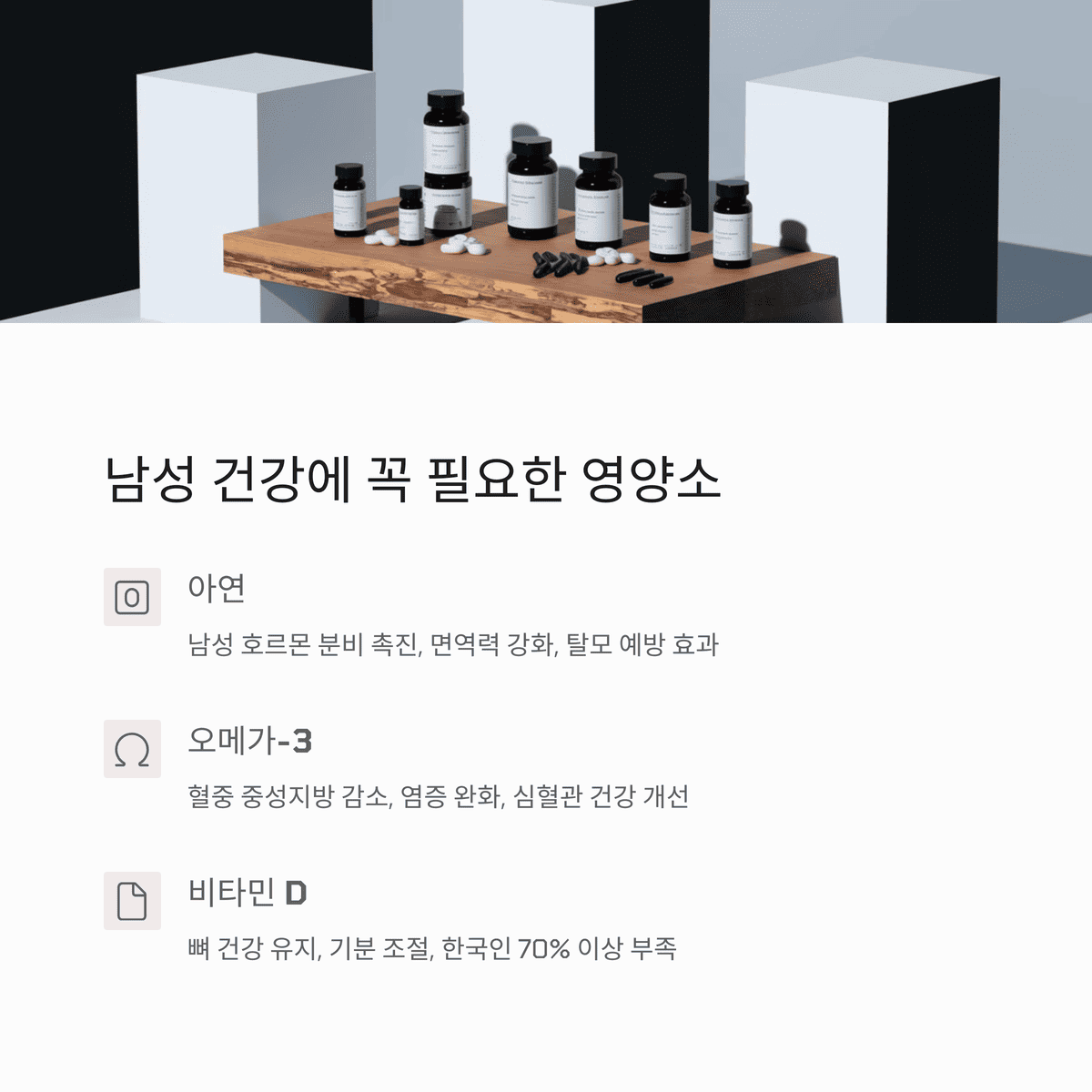 남성 건강은 나이 들수록 더 신경 써야 하는 부분이에요. 필수 영양제로 작은 변화를 시작해보는 건 어떨까요? 아연 하나, 오메가-3 하나 챙기다 보면 몸이 달라지는 게 느껴질 거예요.  건강한 삶을 위한 좋은 기회예요.