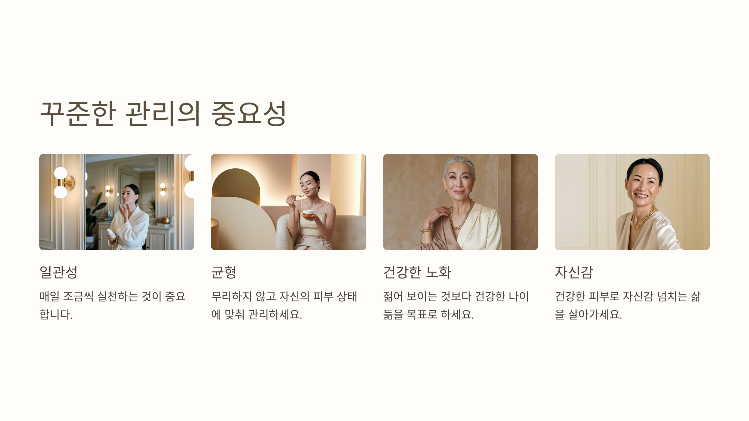 노화를 늦추기 위해서는 한두 가지 방법만 실천하는 것이 아니라, 꾸준한 관리가 필요하다. 하지만 모든 방법을 완벽하게 실천하려다 보면 오히려 스트레스를 받을 수도 있다. 무리해서 모든 것을 지키려 하기보다는, 자신의 피부 상태에 맞춰 실천할 수 있는 것부터 하나씩 시작하는 것이 중요하다.