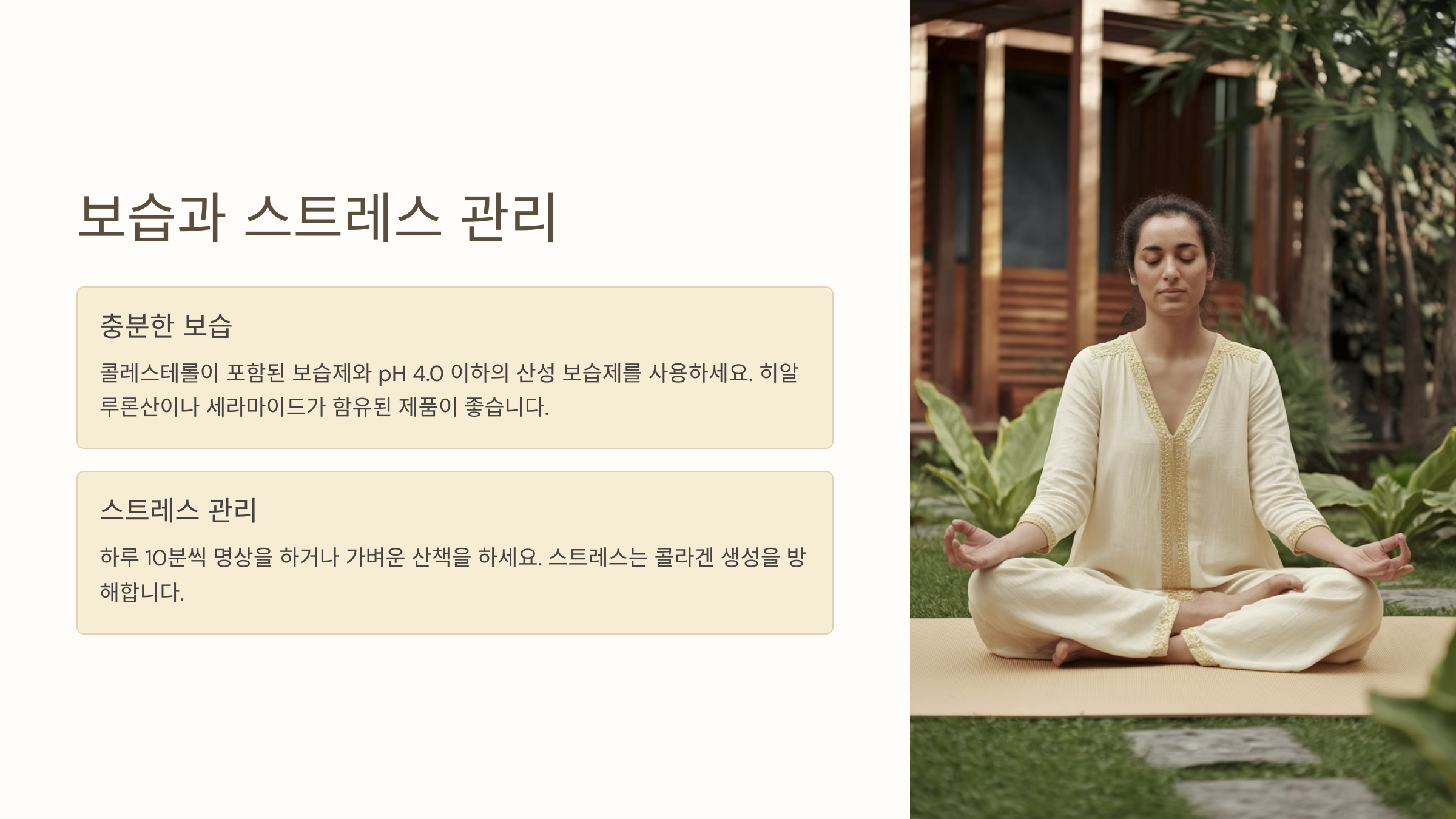 스트레스를 받으면 코르티솔이라는 호르몬이 분비되는데, 이 호르몬이 콜라겐 생성을 방해하고 피부 탄력을 떨어뜨린다. 스트레스를 줄이기 위해 하루 10분씩 명상을 하거나 가벼운 산책을 하는 것이 효과적이다. 처음에는 명상이 어색하게 느껴질 수 있지만, 꾸준히 실천하면 마음이 편안해지고 피부에도 긍정적인 영향을 미친다.