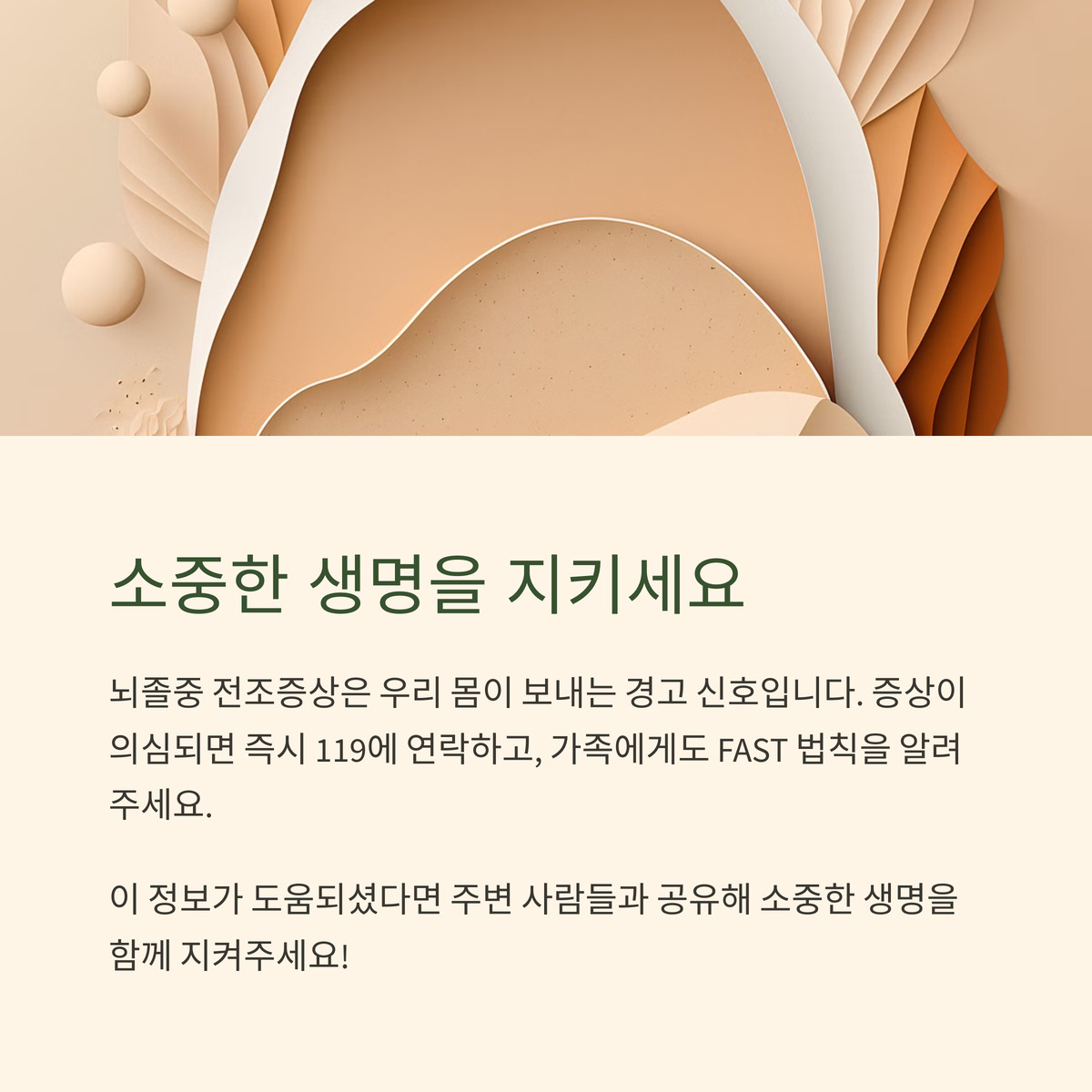 FAST 법칙 기억하고, 생활습관 개선하면서 뇌졸중 신호에 귀 기울이면, 소중한 생명을 지킬 수 있어요.