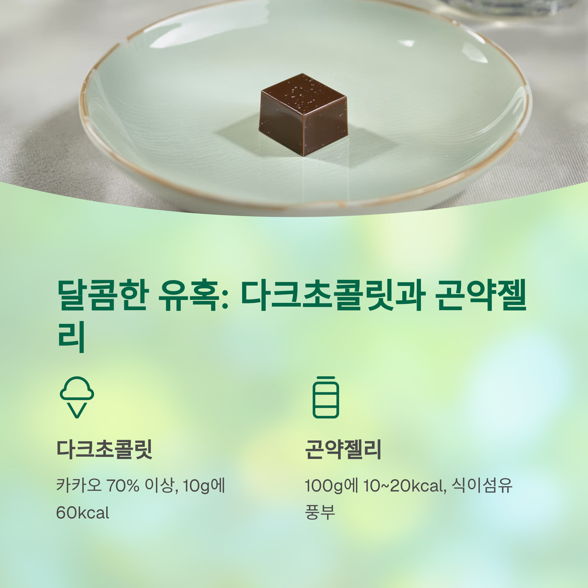 다크초콜릿 조각에 아몬드 2~3알을 곁들이면 고소함과 달콤함이 어우러져요. 이 조합은 다이어트 간식으로 적은 양으로도 만족감을 주니, 저녁에 입이 심심할 때 딱이죠.
