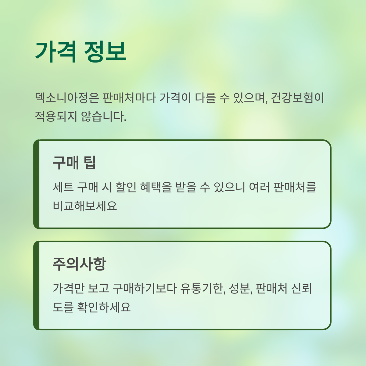 참고로, 덱소니아정은 전문의약품이 아닌 일반식품이기 때문에 건강보험 적용 대상이 아닙니다. 따라서 병원 처방 없이도 구매할 수 있지만, 약값 전체를 본인이 부담해야 합니다. 가격에 대한 정보는 구매를 고려하고 있는 시점에 맞춰 판매처의 프로모션이나 할인 혜택 등을 확인하는 것이 가장 현명한 방법입니다. '무조건 싸다'고 해서 구매하기보다는, 유통기한이나 성분, 그리고 판매처의 신뢰도 등을 함께 확인하는 것이 중요합니다.