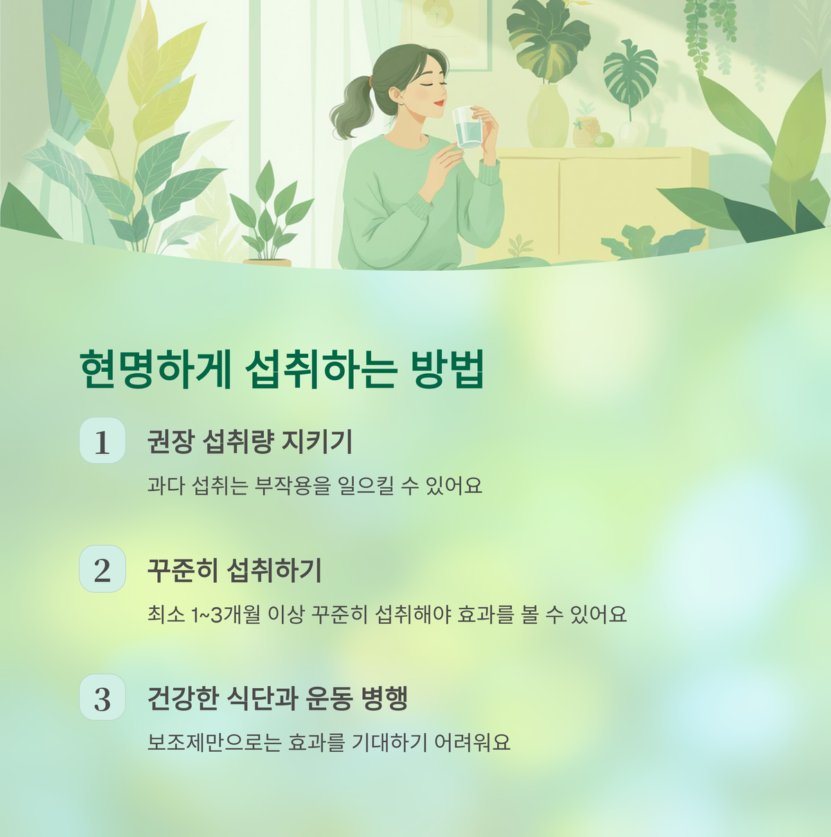 - 올바른 섭취법: 권장량을 지키고, 건강한 식단과 운동을 병행하며 꾸준히 섭취해야 효과를 볼 수 있습니다.