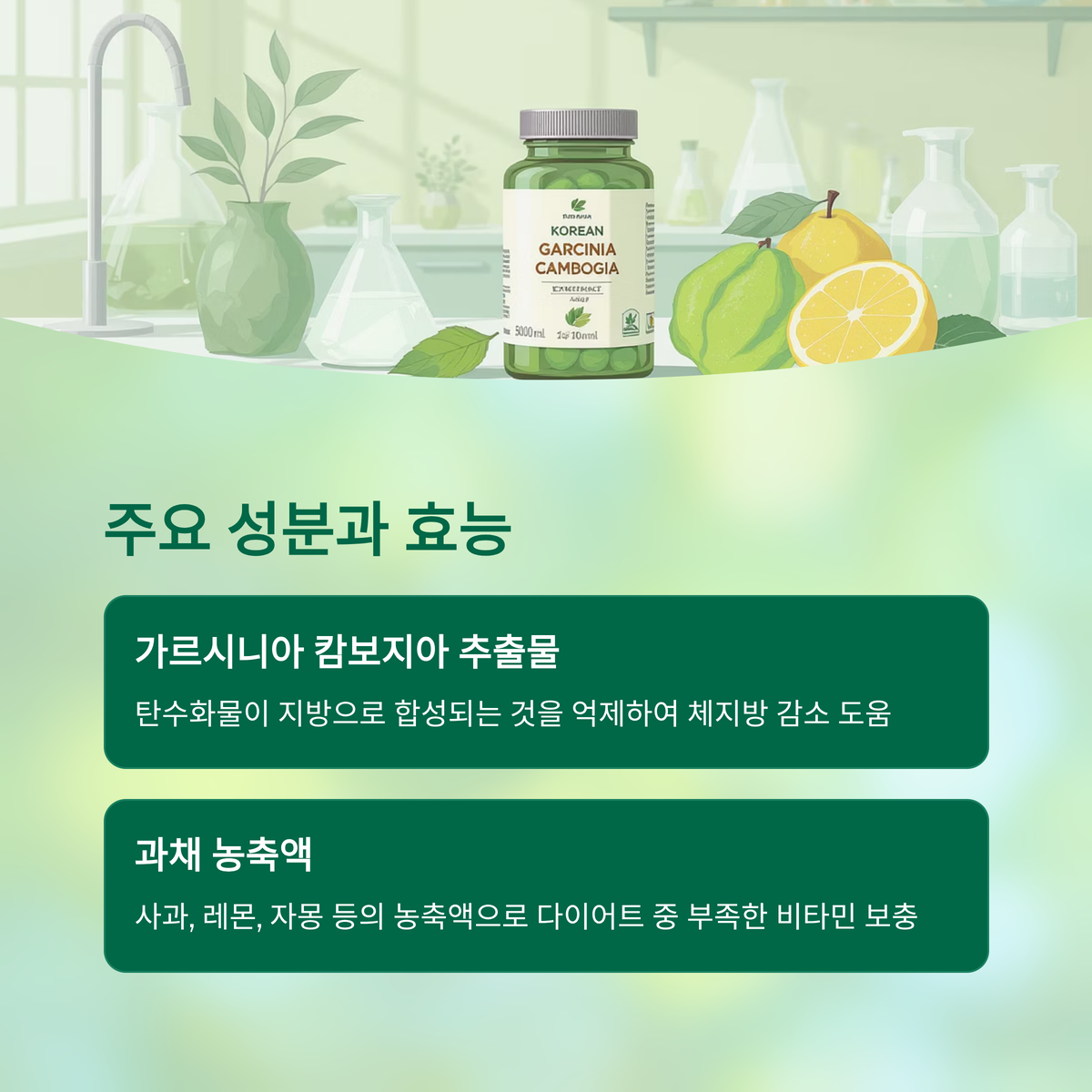 이 제품의 주요 성분은 체지방 감소에 도움을 줄 수 있는 것으로 알려진 가르시니아 캄보지아 추출물과 함께, 식이섬유, 비타민 등이 함유된 과채가공품이라고 합니다. 따라서 단순히 체중을 줄이는 것이 아닌, 다이어트 중 부족해지기 쉬운 영양 성분들을 보충해주고, 신체 대사를 활성화하여 다이어트 효과를 높이는 데 도움을 줄 수 있다는 점을 내세우고 있습니다. 마치 다이어트라는 긴 여정에서 나를 도와주는 든든한 조력자 같다고 생각하시면 됩니다.