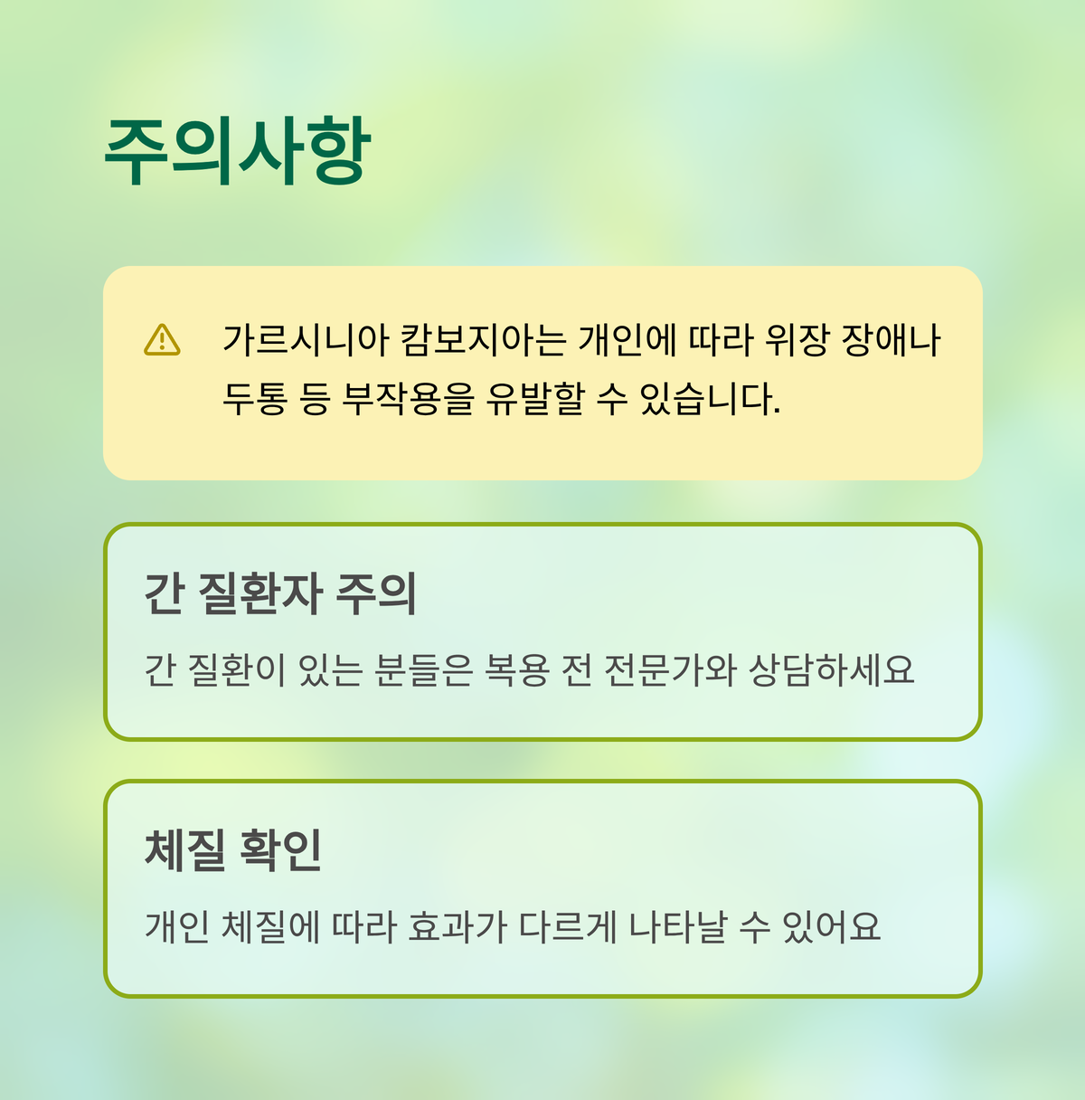 가르시니아 캄보지아는 개인에 따라 위장 장애나 두통 등 부작용을 유발할 수 있습니다. 특히 간 질환이 있는 분들은 복용 전 전문가와 상담하는 것이 안전합니다.