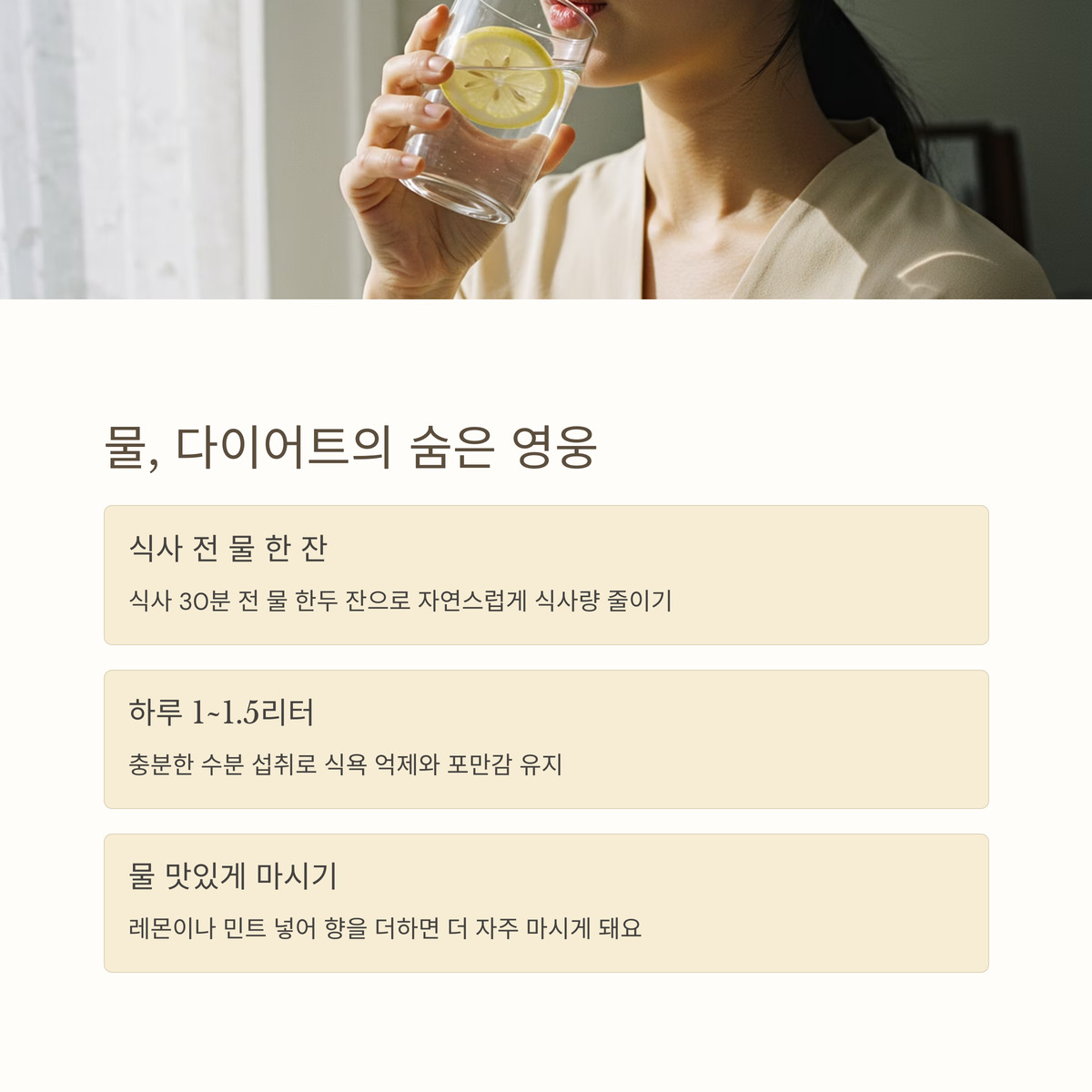 만약 물맛이 밋밋하다면, 레몬 조각이나 민트를 넣어 향을 더해보세요. 맛있는 물은 더 자주 마시게 되니까, 식욕 억제 효과도 더 커질 거예요.