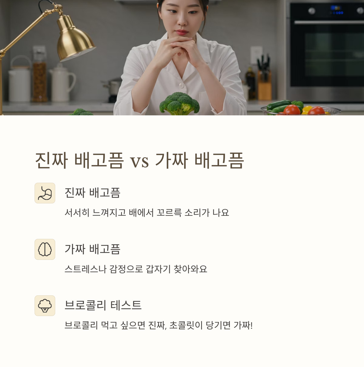 가짜 배고픔을 구별하는 쉬운 방법 중 하나는 ‘브로콜리 테스트’예요. 배고플 때 브로콜리나 오이 같은 저칼로리 음식을 먹고 싶은지 생각해보세요. “그래, 브로콜리라도 먹자!” 싶으면 진짜 배고픔이고, “아니, 초콜릿이나 떡볶이가 먹고 싶어!” 하면 가짜 배고픔일 가능성이 높아요. 이 테스트는 배고픔의 원인을 빠르게 파악하는 데 큰 도움이 된답니다.
