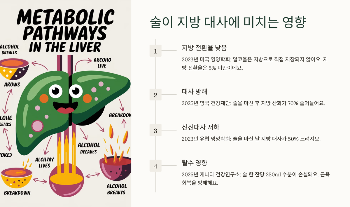 술은 신진대사에도 영향을 줘요. 다이어트 중 술을 마시면 간이 알코올 분해에 집중하느라 지방 태우는 일을 미뤄요. 2023년 유럽 영양학회 연구에 따르면, 술을 마신 날 지방 대사가 50% 느려진다고 해요. 또, 알코올은 탈수를 일으켜요. 2025년 캐나다 건강연구소 자료에 따르면, 술 한 잔(알코올 20g)당 250ml 수분이 손실돼요. 탈수는 근육 회복을 방해하고, 다음 날 피로감으로 운동을 건너뛰게 만들죠. 그러니까 술이 직접 살을 찌게 하진 않더라도, 다이어트 흐름을 망칠 수 있어요.