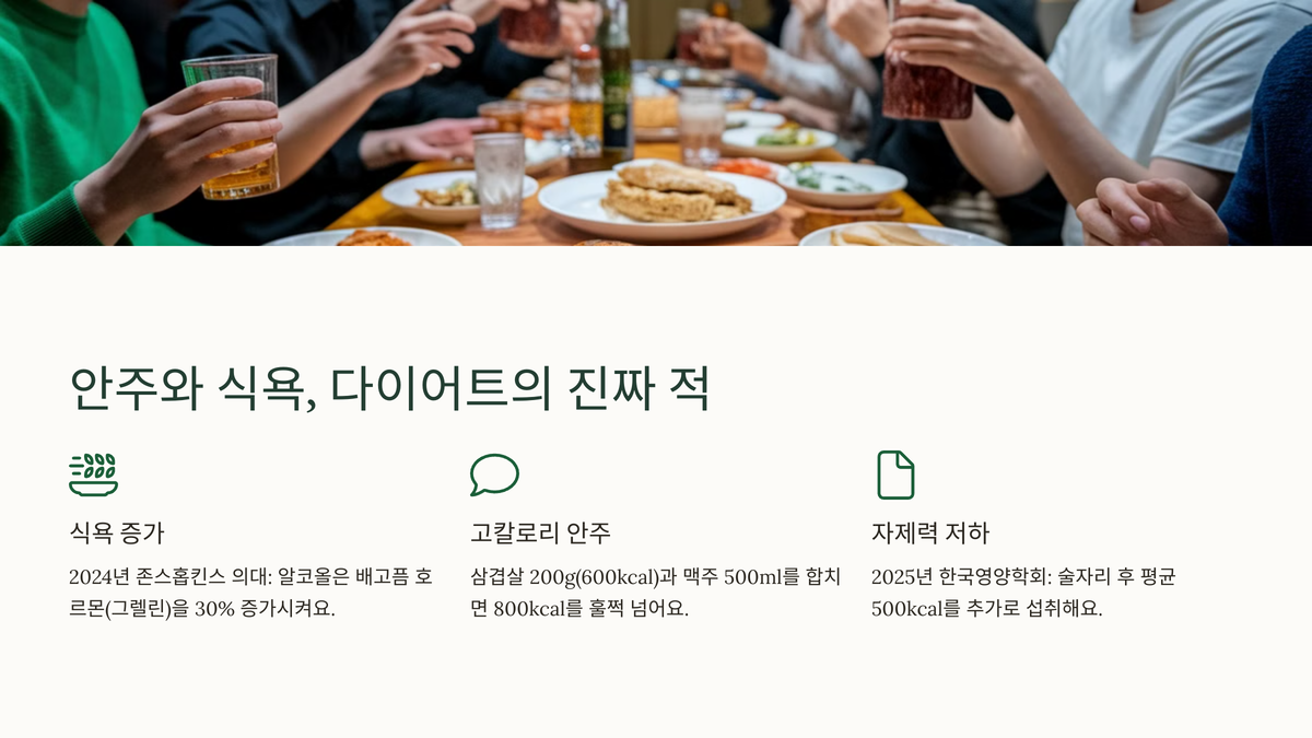다이어트 중 술 마실 때 진짜 조심해야 할 건 안주예요. 술을 마시면 식욕이 늘어나죠. 2024년 존스홉킨스 의대 연구에 따르면, 알코올은 배고픔 호르몬(그렐린)을 30% 증가시킨다고 해요. 그래서 삼겹살, 치킨 같은 고칼로리 안주가 당기죠. 예를 들어, 삼겹살 200g은 600kcal, 맥주 500ml와 합치면 800kcal를 훌쩍 넘어요. 게다가 술에 취하면 자제력이 떨어져 과식하기 쉬워요. 2025년 한국영양학회 조사에서 술자리 후 평균 500kcal 추가 섭취한다고 하네요. 다이어트 중이라면 안주 선택이 중요해요.