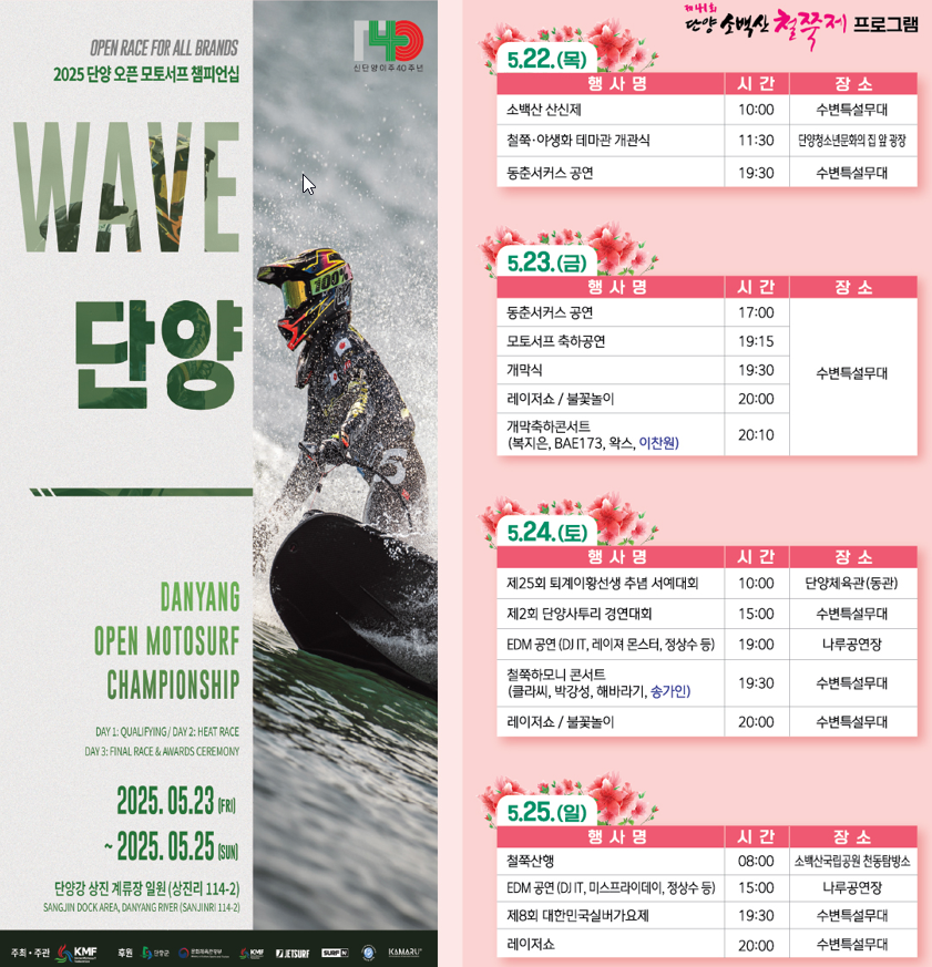 - 모터서프 축하공연: 단양강에서 펼쳐지는 수상 퍼포먼스.