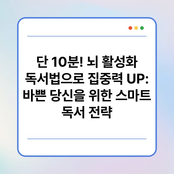 바쁜 일상 속에서 독서는 정말 소중한 시간이죠. 하지만 짧은 시간 안에 집중력을 높이면서 효과적으로 독서를 하는 방법이 있을까요? 오늘은 단 10분 만에 뇌를 활성화하고 집중력을 높일 수 있는 스마트 독서 전략을 소개해드릴게요. 이 방법은 바쁜 당신에게 딱 맞는 효율적인 방법이니 기대해보세요! 이제 함께 알아보도록 해요.