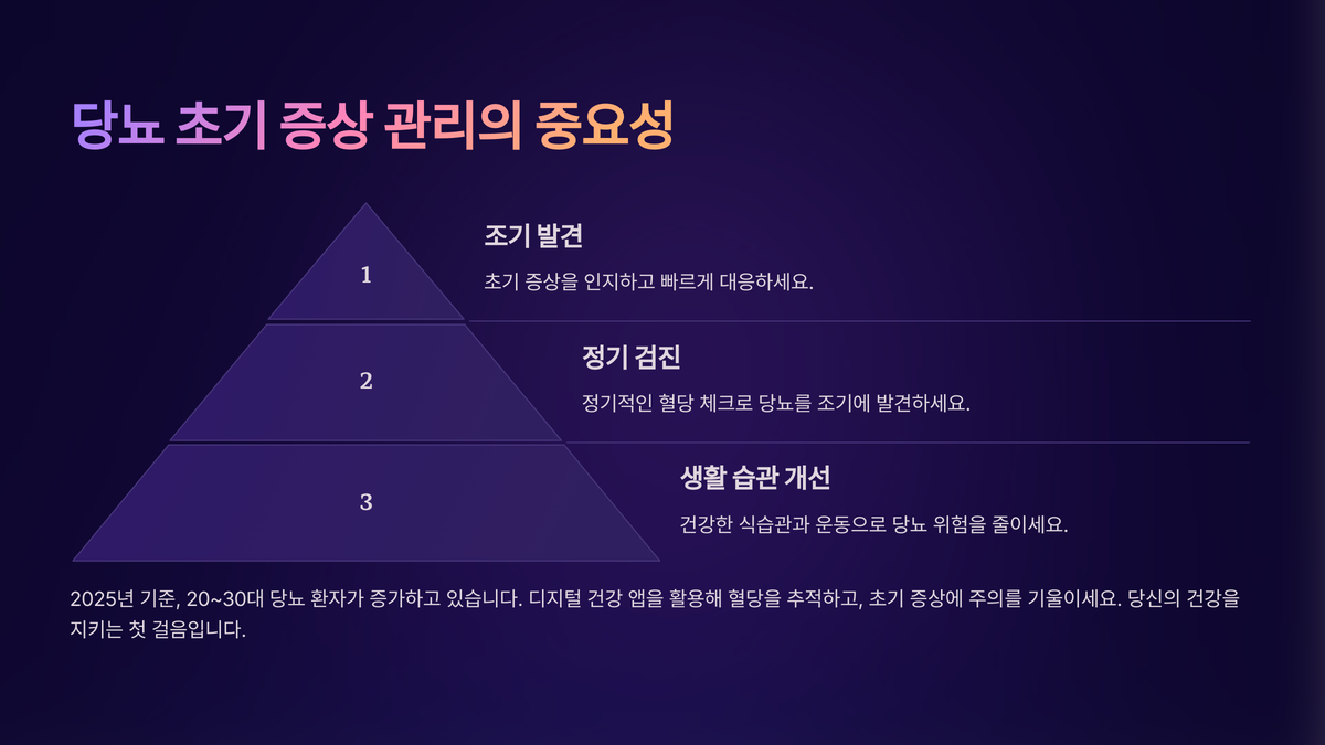 2025년 3월 기준, 건강보험심사평가원 통계에 따르면 20~30대 당뇨 환자가 2020년 10만 명에서 2024년 12만 명으로 늘었어요. 비만과 스트레스 늘면서 초기 증상 놓치는 사람도 많아졌죠. 다행히 디지털 건강 앱(예: 헬스케어 앱)으로 혈당 추적 쉬워져서, 이런 신호 느끼면 바로 체크해볼 수 있어요. 저도 요즘 앱으로 기록하며 관리 시작했어요!