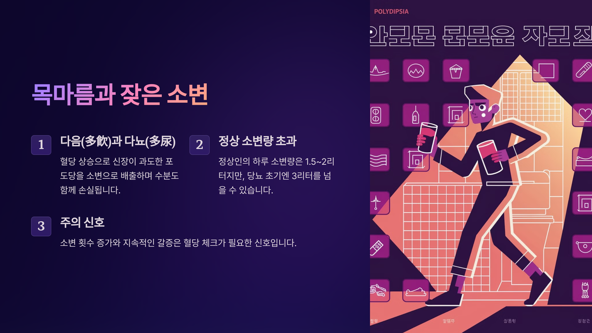 당뇨 초기 증상으로 가장 흔한 게 바로 목마름과 잦은 소변이에요. 혈당이 높아지면 신장이 과도한 포도당을 소변으로 내보내려고 열심히 일하는데, 이때 물도 같이 끌고 나가요. 그래서 소변량이 늘고, 몸이 수분 부족을 느끼면서 갈증이 심해지는 거예요. 대한당뇨병학회(2024년 DFS 보고서)에 따르면, 당뇨 환자의 약 70%가 초기 증상으로 이런 “다음(多飮)”과 “다뇨(多尿)”를 겪었다고 해요.
