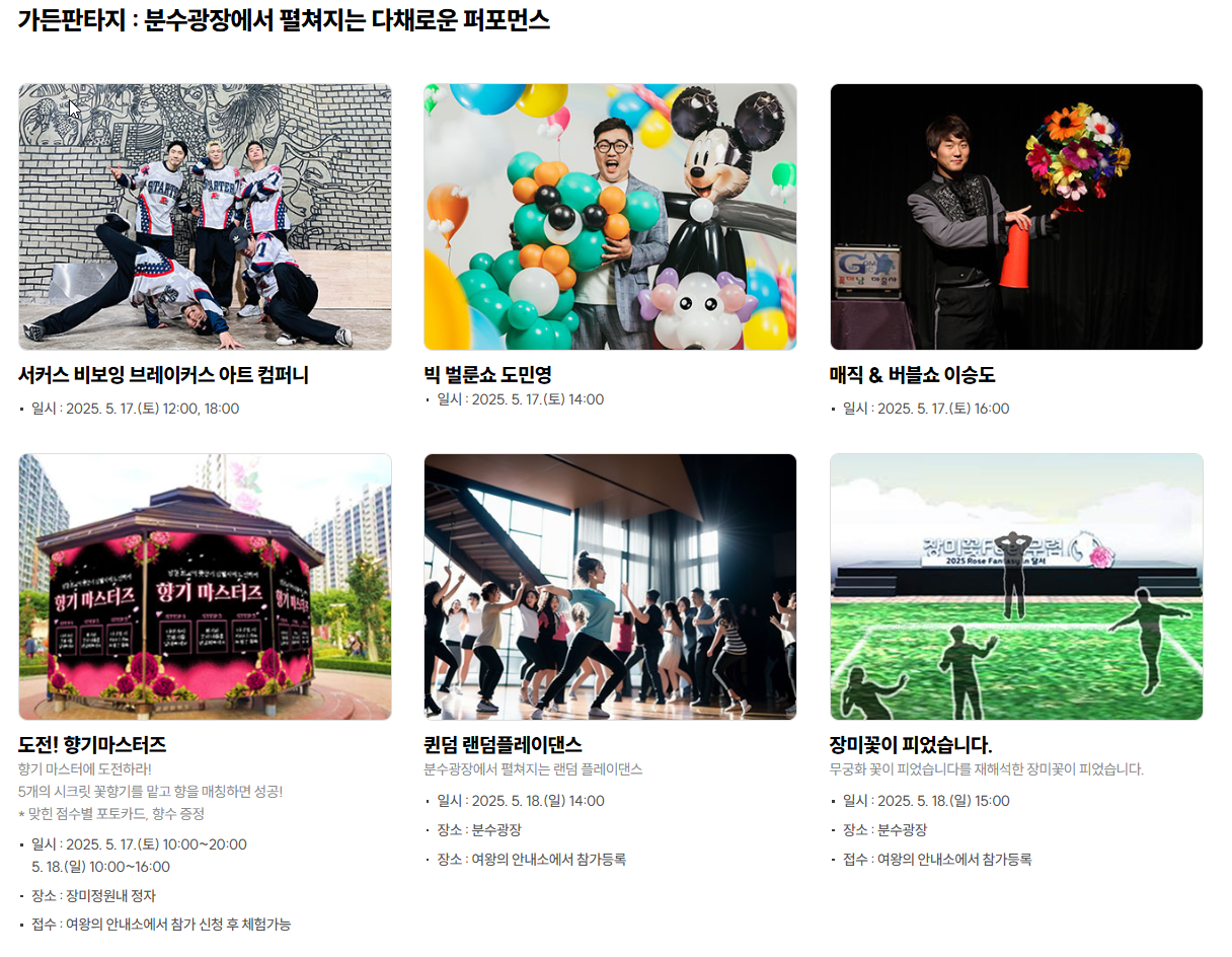 장미꽃 필(Feel) 무렵의 무대 프로그램은 축제의 하이라이트야. 장미 정원 속에서 펼쳐지는 다채로운 공연을 만나보자.