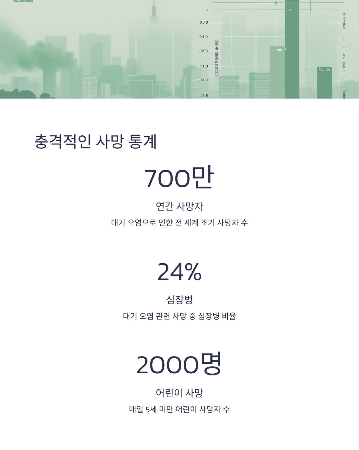 대기 오염은 침묵의 살인자로, 폐, 심장, 뇌, 정신 건강을 위협하며 매년 700만 명의 목숨을 앗아가요. 심장병, 뇌졸중, 폐암 같은 질병이 주요 사망 원인이죠.
