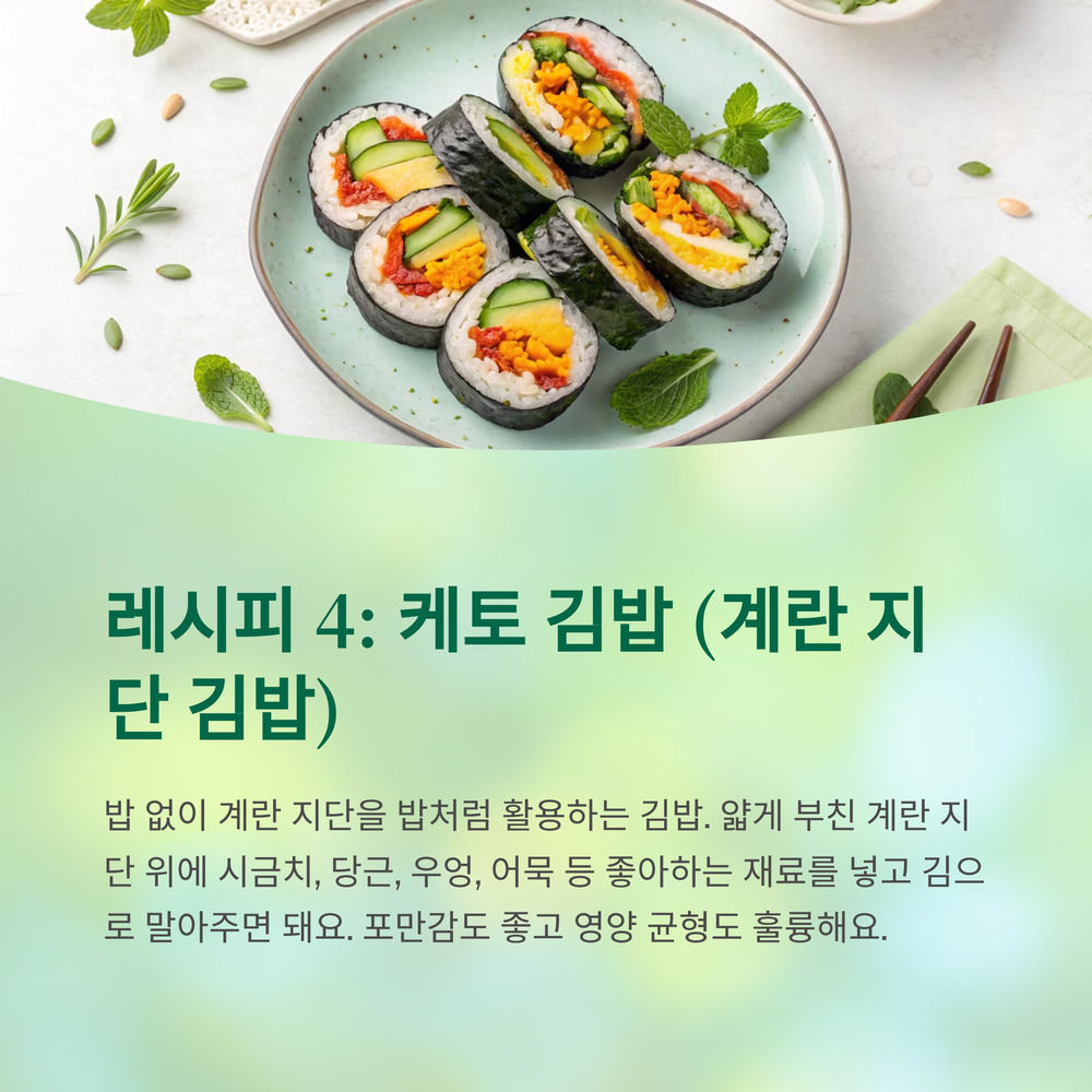 - 4. 케토 김밥 (계란 지단 김밥): 밥 없이 계란 지단을 밥처럼 활용하는 김밥이에요. 얇게 부친 계란 지단 위에 시금치, 당근, 우엉, 어묵 등 좋아하는 재료를 넣고 김으로 말아주면 돼요. 포만감도 좋고 영양 균형도 훌륭하답니다.