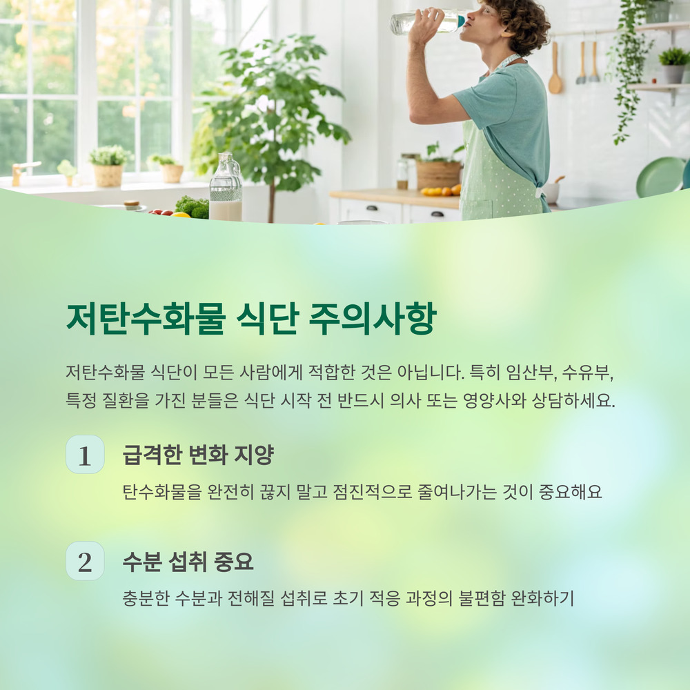 저탄수화물 식단은 모든 사람에게 적합한 것은 아닙니다. 특히 임산부, 수유부, 특정 질환을 가진 분들은 식단 시작 전 반드시 의사 또는 영양사와 상담하는 것이 중요합니다.