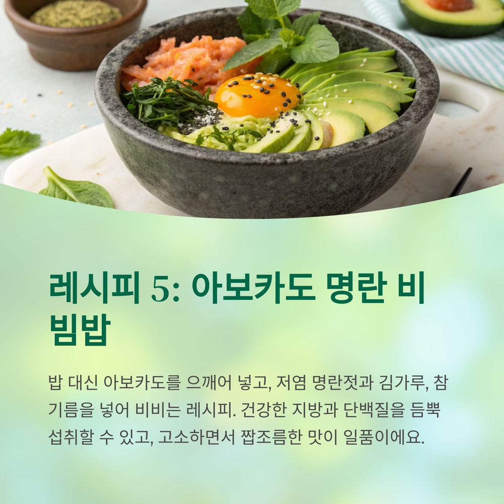 - 5. 아보카도 명란 비빔밥: 밥 대신 아보카도를 으깨어 넣고, 저염 명란젓과 김가루, 참기름을 넣어 비비는 레시피예요. 건강한 지방과 단백질을 듬뿍 섭취할 수 있고, 고소하면서 짭조름한 맛이 일품이랍니다. 저는 여기에 김치 대신 쌈 채소를 곁들여 먹어요!