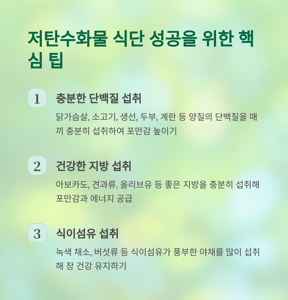 제가 생각하는 저탄수화물 식단 성공을 위한 핵심 팁은 다음과 같아요: