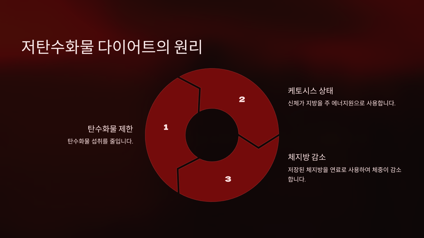 즉, 저탄수화물 다이어트는 탄수화물 대신 지방을 연료로 사용하여 체지방을 줄이는 원리입니다.