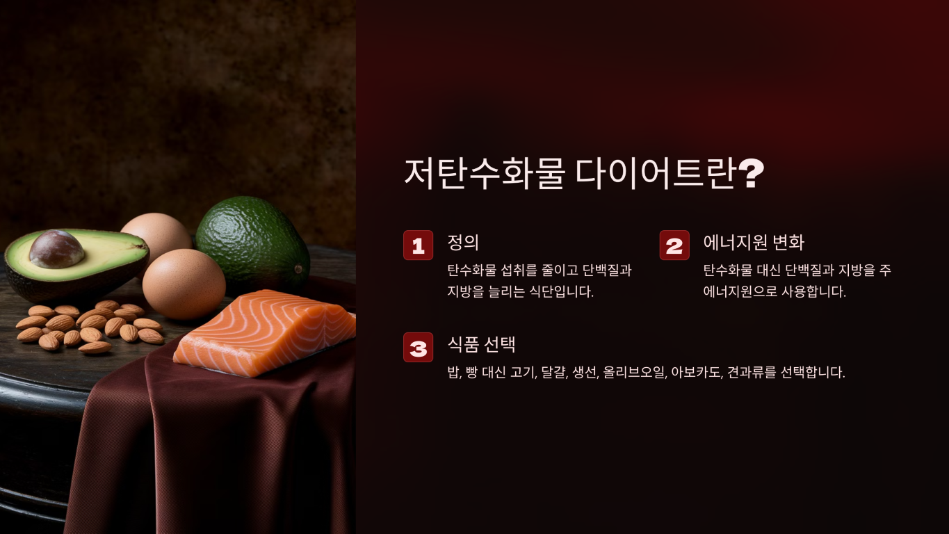저탄수화물 다이어트는 탄수화물 섭취를 줄이고 단백질과 지방을 늘리는 식단을 의미합니다.