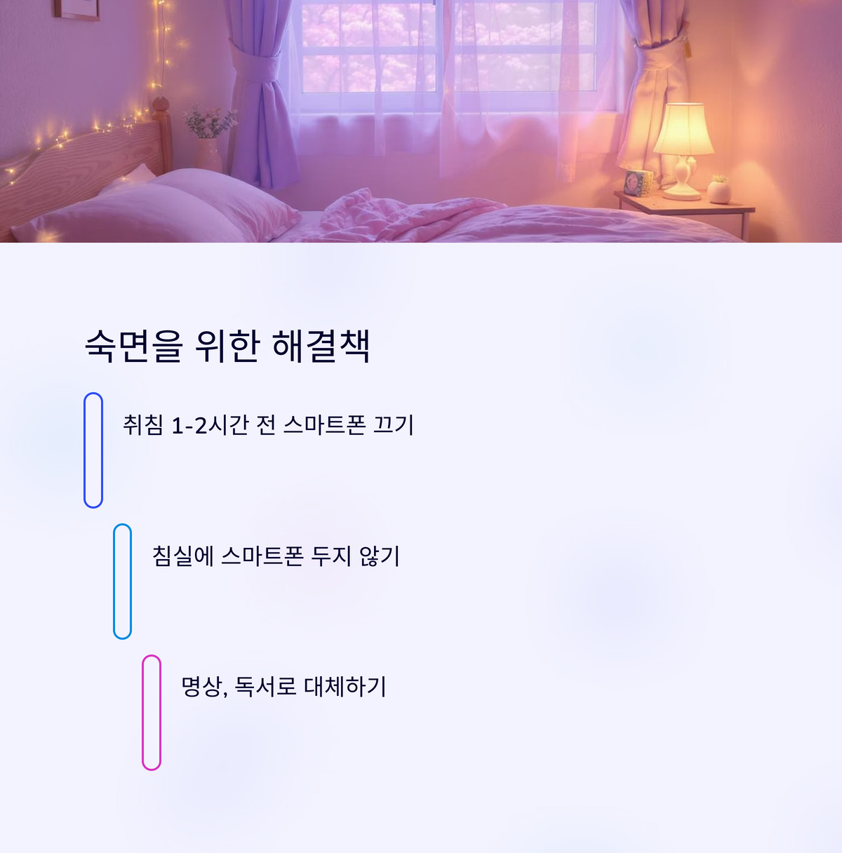 숙면을 위해 스마트폰 사용을 줄이는 게 중요해요. 잠들기 최소 1~2시간 전에는 스마트폰을 끄고, 차분한 활동으로 전환하세요. 예를 들어, 종이책을 읽거나 가벼운 스트레칭을 하면 뇌가 이완돼요.
