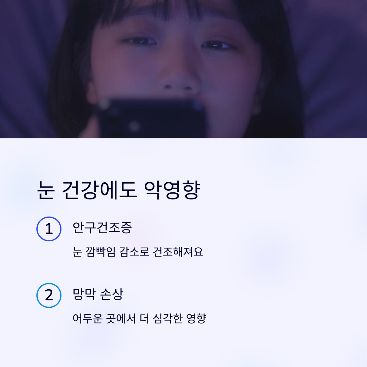 밤에 스마트폰을 오래 보면 눈이 쉽게 피로해져요. 화면을 집중해서 볼 때 눈 깜빡임 횟수가 줄어들어 안구건조증이 생길 수 있어요. 안구건조증은 눈이 뻑뻑하고 따끔거리는 증상을 유발하며, 심하면 각막 손상으로 이어질 수 있어요.