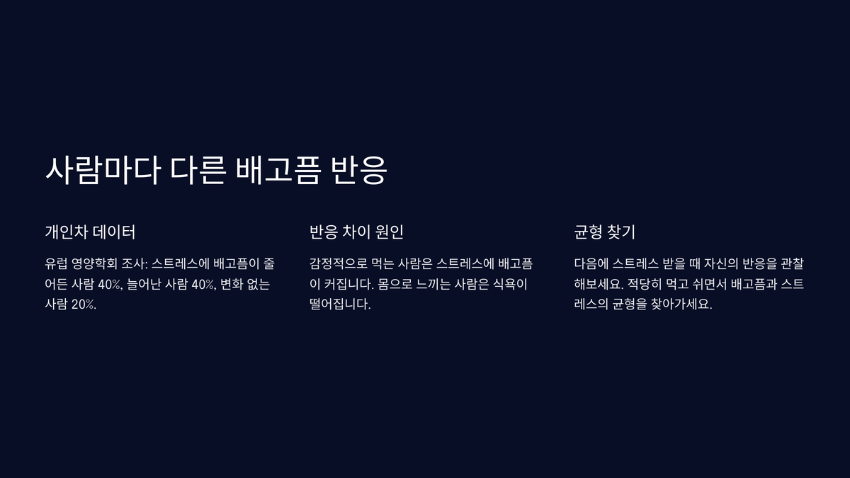 배고픔과 스트레스의 관계는 사람마다 달라요. 2024년 유럽 영양학회 조사에서 스트레스에 배고픔이 줄어든다는 사람이 40%, 늘어난다는 사람이 40%, 변화 없는 사람이 20%였어요. 이 차이는 호르몬 반응과 대처 방식 때문이에요. 감정적으로 먹는 사람은 스트레스에 배고픔이 커지고, 몸으로 느끼는 사람은 식욕이 떨어지죠. 그러니까 개인마다 다른 반응이 나타날 수 있어요.