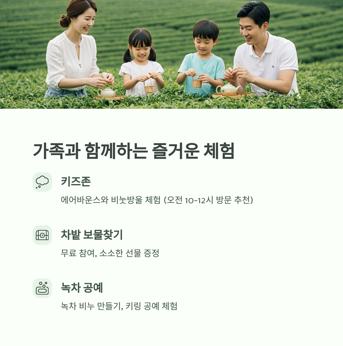 에어바운스 키즈존, 차밭 보물찾기, 녹차 비누 만들기, 키링 공예 등 아이와 부모 모두 즐길 수 있는 부스가 준비돼 있어요.