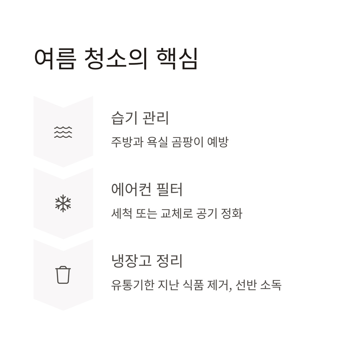 주방은 여름철 음식물 쓰레기가 쉽게 상할 수 있어요. 쓰레기통을 자주 비우고, 식초로 닦으면 냄새와 세균을 잡을 수 있죠. 냉장고도 한 달에 한 번 정리하면서 유통기한 지난 식품을 버리고, 선반을 소독하면 위생적이에요.