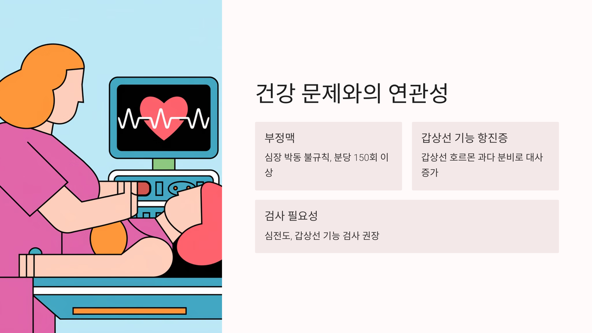또 다른 가능성은 갑상선 기능 항진증이에요. 갑상선 호르몬이 과다 분비되면 대사가 빨라지면서 심장이 쿵쾅대고, 불안감까지 커질 수 있어요. 2024년 건강보험심사평가원 통계를 보면, 우리나라에서 갑상선 질환 환자가 약 70만 명에 달한다고 해요. 불안과 심장 두근거림이 자주 반복된다면, 병원에서 심전도 검사나 갑상선 기능 검사를 받아보는 것도 나쁘지 않을 거예요. 저도 한 번 겁나서 검사받아봤는데, 다행히 스트레스 탓이었어요.