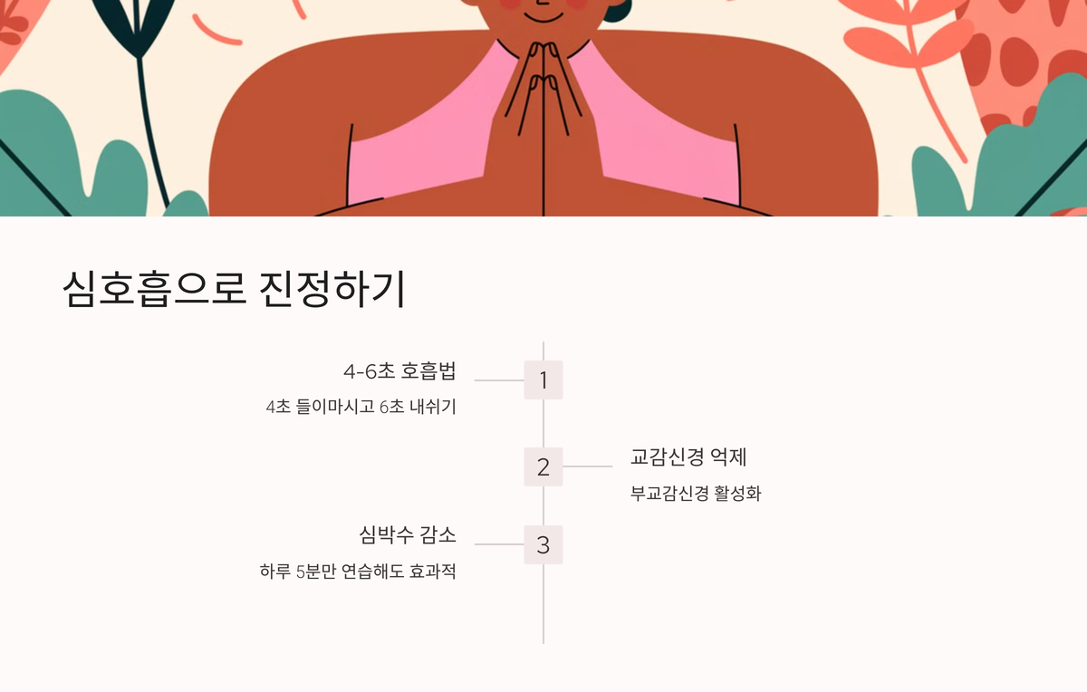 첫 번째로 추천하는 건 심호흡이에요. 불안할 때 숨이 얕고 빨라지는데, 천천히 코로 숨을 들이마시고 입으로 내뱉어보세요. 2024년 미국심리학회 연구에서, 4초 들이마시고 6초 내뱉는 호흡법이 교감신경을 억제하고 부교감신경을 활성화해서 심박수를 낮춘다고 밝혔어요. 저도 이 방법으로 발표 전 불안을 많이 줄였어요. 하루 5분만 연습해도 효과를 느낄 거예요.