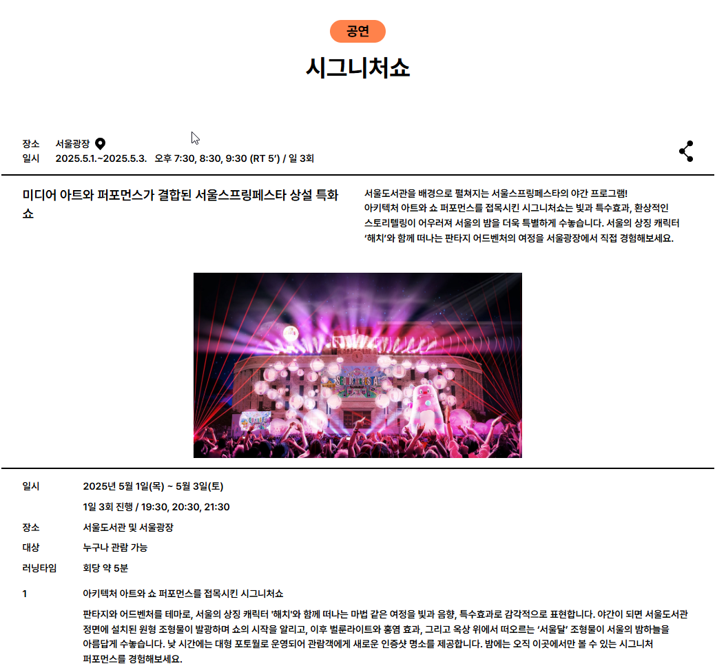 서울스프링페스타는 ‘3 빅쇼’로 대표돼요. 첫 번째 원더쇼 외에도, 5월 1일부터 3일까지 서울도서관에서 열리는 ‘시그니처쇼’는 레이저와 라이트 벌룬, 특수효과가 어우러진 디지털 예술 공연이에요. 매일 저녁 7시 30분, 8시 30분, 9시 30분에 펼쳐지죠.