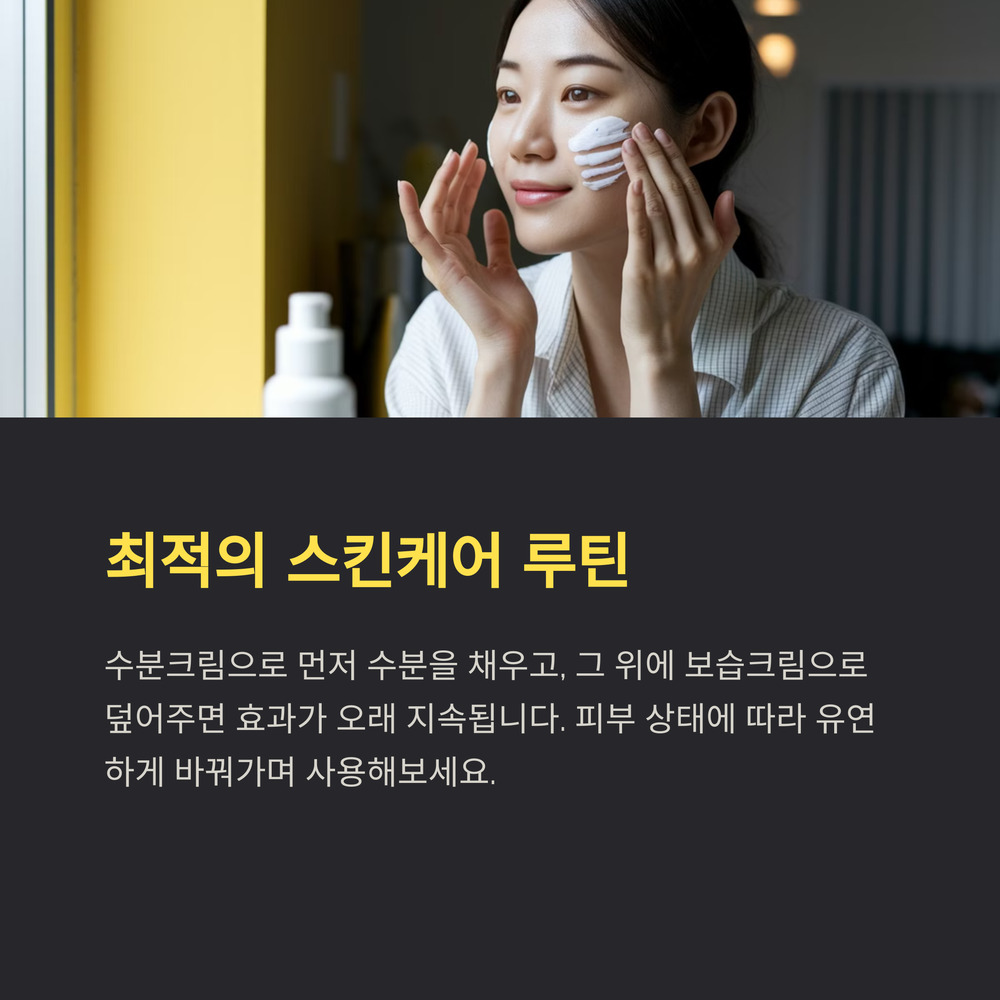 사실 수분크림이랑 보습크림을 같이 쓰는 것도 좋은 방법이에요. 먼저 수분크림으로 피부 속을 촉촉하게 채우고, 그 위에 보습크림으로 덮어주면 수분이 더 오래 간다고 생각하면 돼요.