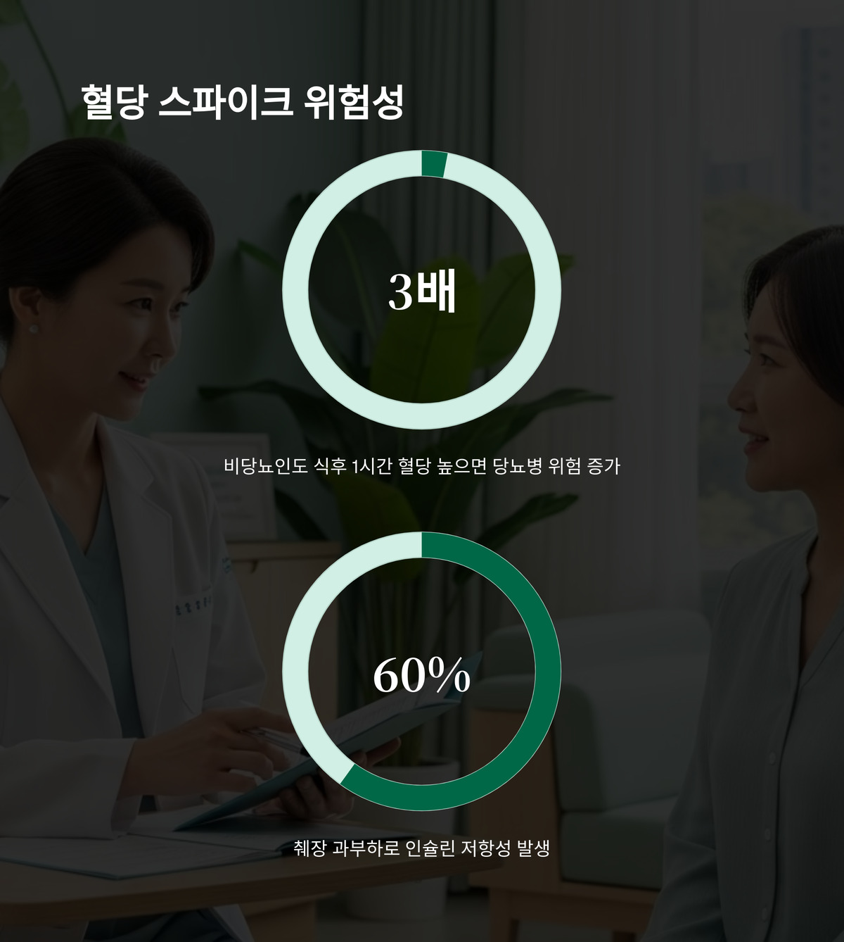 식후 혈당 수치가 급격히 오르내리면 췌장이 과도하게 인슐린을 분비하느라 지치게 돼요. 이 과정이 반복되면 인슐린 저항성이 생겨 혈당 조절이 어려워지고, 결국 당뇨병으로 이어질 수 있어요. 게다가 혈당 스파이크는 혈관을 손상시켜 심근경색, 뇌경색 같은 심혈관 질환 위험도 높여요.