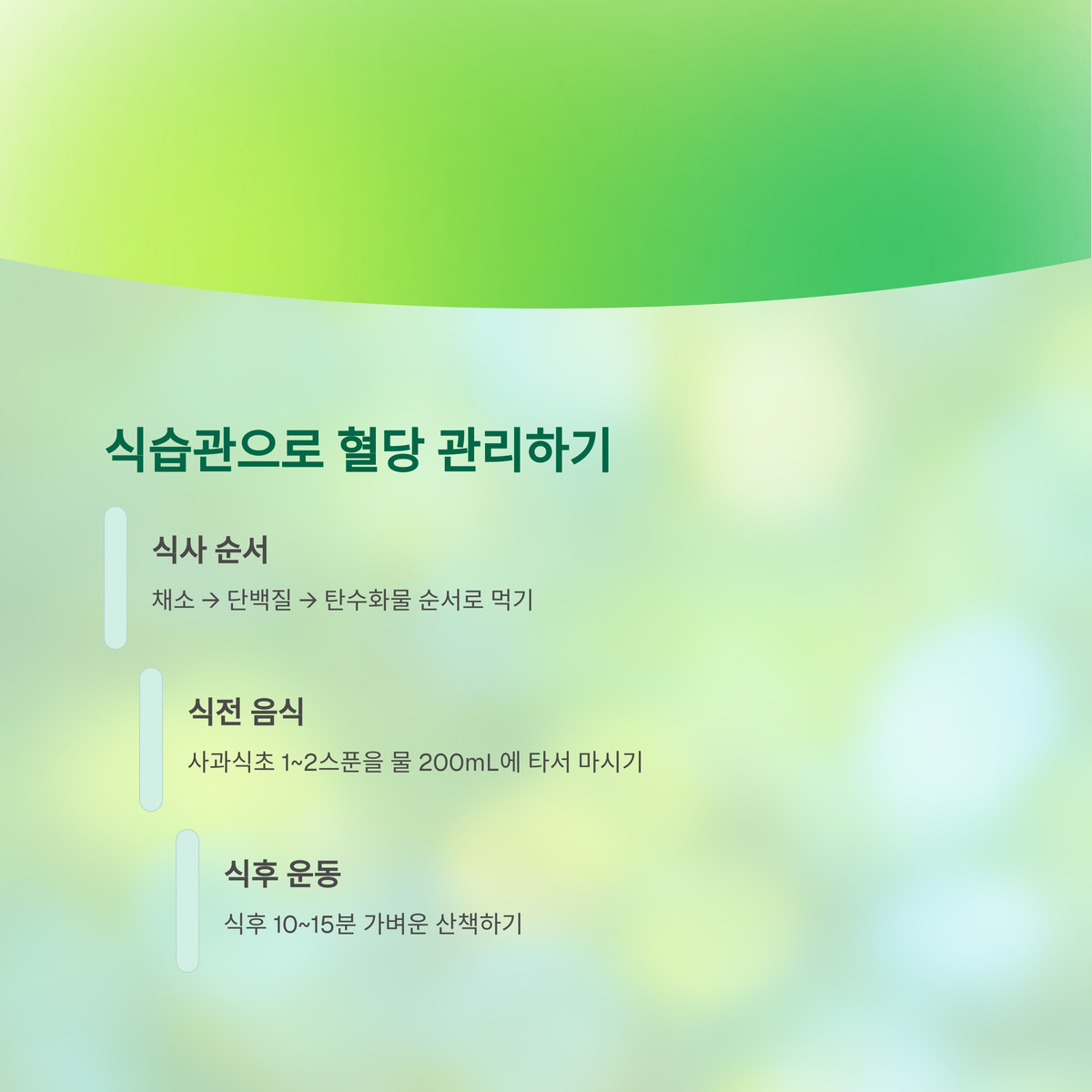 식전에 특정 음식을 먹으면 혈당 스파이크를 줄일 수 있어요. 동아사이언스에서 소개한 바에 따르면, 사과식초(애플사이다비니거)를 물에 타서 마시면 혈당 상승이 완만해진다고 해요. 사과식초 1~2스푼을 물 200mL에 희석해 식전에 마셔보세요.